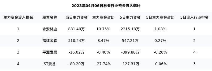 从主力资金流向来看,林业行业今日主力资金流入4078.62万元,在所有申万二级行业中排名:33/131。