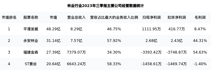 ST景谷最新报告期数据为三季报,下表汇总了林业行业内市值靠前的公司三季报主要经营数据