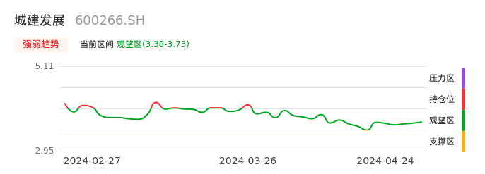 我们来看一下该股的九方特色指标强弱趋势的情况:城建发展自04月17日从支撑区回到观望区。股价前期快速下跌后经过中途弱势整理。目前短期处于弱势反弹迹象,后续重点关注能否站上多空分界点:3.73元。如未能有效突破则说明弱势反弹行情结束。后续可能再次进入空头行情。