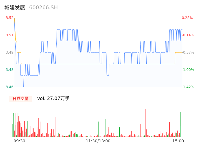 04月24日,城建发展收报3.51,股价涨幅0.00%,成交金额9436.82万元,换手率1.26%。