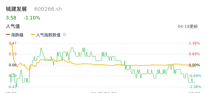 04月18日,城建发展收报3.58,股价涨幅-1.10%,成交金额1.45亿元,换手率1.86%。
