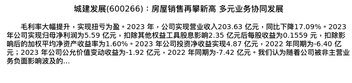 值得注意的是:2024年04月海通证券的分析师,首次发布关于城建发展的研究报告,标题为:城建发展(600266):房屋销售再攀新高 多元业务协同发展。