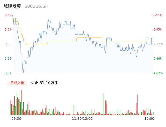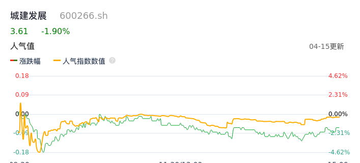 04月15日,城建发展收报3.61,股价涨幅-1.90%,成交金额2.21亿元,换手率2.84%。