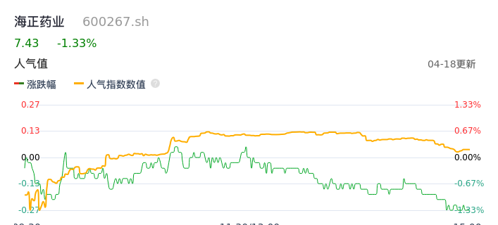 04月18日,海正药业收报7.43,股价涨幅-1.33%,成交金额6012.58万元,换手率0.67%。