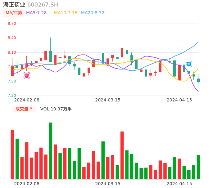 04月15日,海正药业收报7.48,股价涨幅-1.58%,成交金额8249.83万元,换手率0.92%。