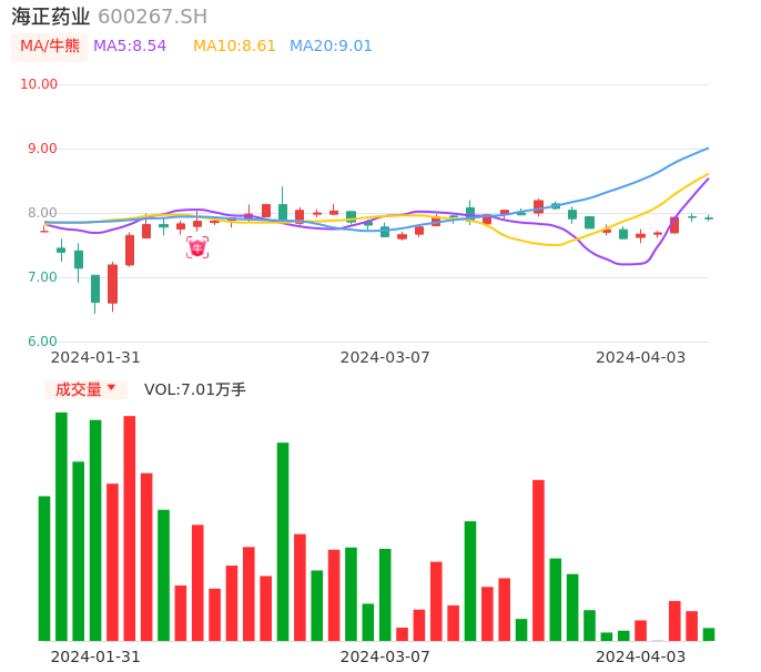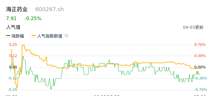 04月03日,海正药业收报7.91,股价涨幅-0.25%,成交金额5546.17万元,换手率0.59%。
