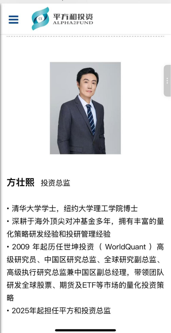 从担任核心高管,到股权分配,方壮熙的加入对公司的影响也是业内关注焦点。公开资料显示,自2009年起,方壮熙历任世坤投资(WorldQuant)高级研究员、中国区研究总监、全球研究副总监、高级执行研究总监兼中国区副总经理,带领团队研发全球股票、期货及ETF等市场的量化投资策略。