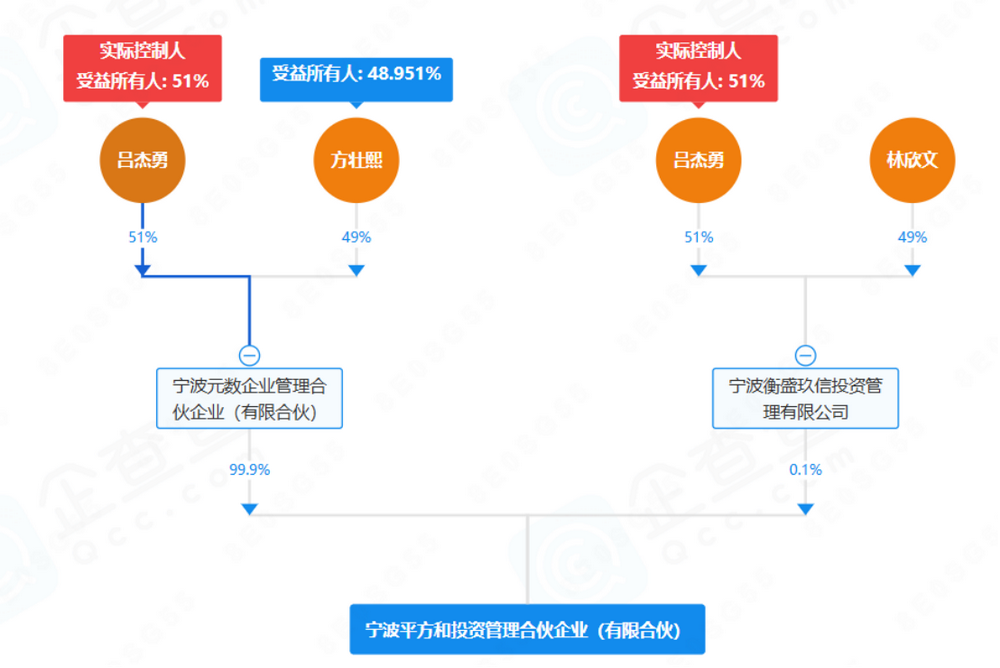 这意味着,此轮调整后,平方和投资穿透后的股权结构发生变化。中基协数据显示,平方和投资的股东包括宁波元数(持股比例99.9%)和宁波衡盛玖信投资(持股比例0.1%)。由于这2位股东背后的实控人均为平方和投资创始人吕杰勇,穿透来看,吕杰勇合计间接持有平方和投资51%的股份;而方壮熙穿透以后持有平方和投资的股权为48.95%。