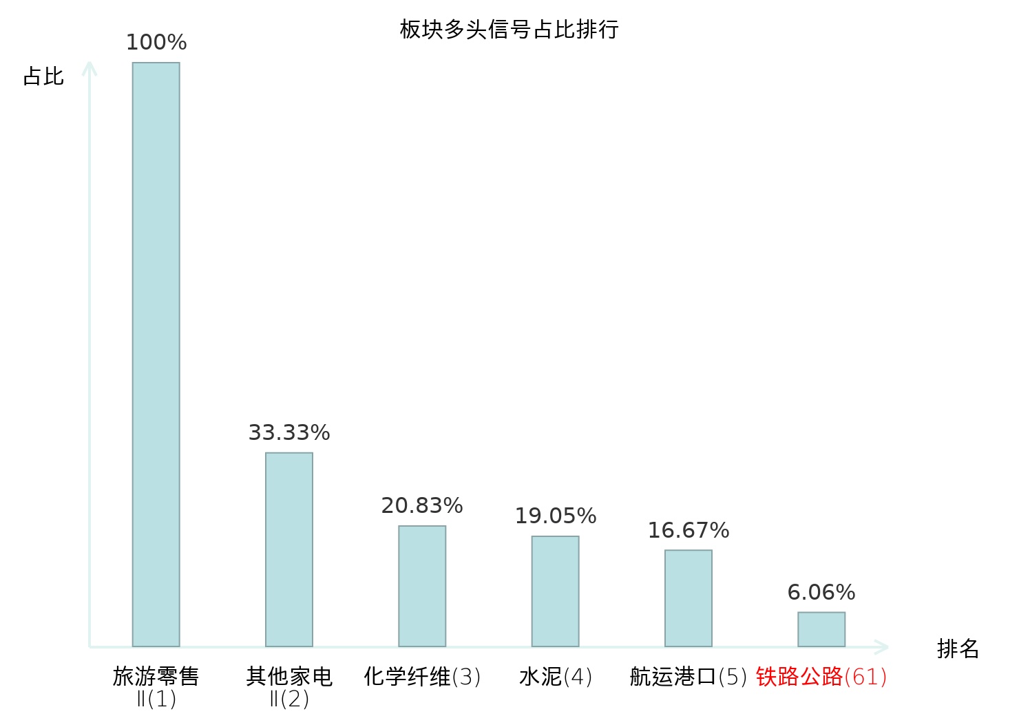 全市场所有行业板块中主力多头信号占比排名中,旅游零售Ⅱ板块位居第一。旅游零售Ⅱ板块名次提升最快,较昨日上升130位。