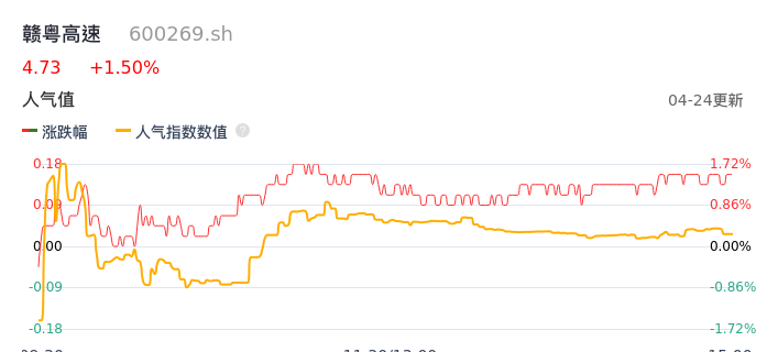 04月24日,赣粤高速收报4.73,股价涨幅1.50%,成交金额6092.93万元,换手率0.55%。