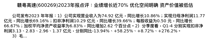 值得注意的是:2024年03月华创证券的吴一凡/吴晨玥/黄文鹤/梁婉怡分析师,首次发布关于赣粤高速的研究报告,标题为:赣粤高速(600269)2023年报点评:业绩增长近70% 优化空间明确 资产价值被低估。