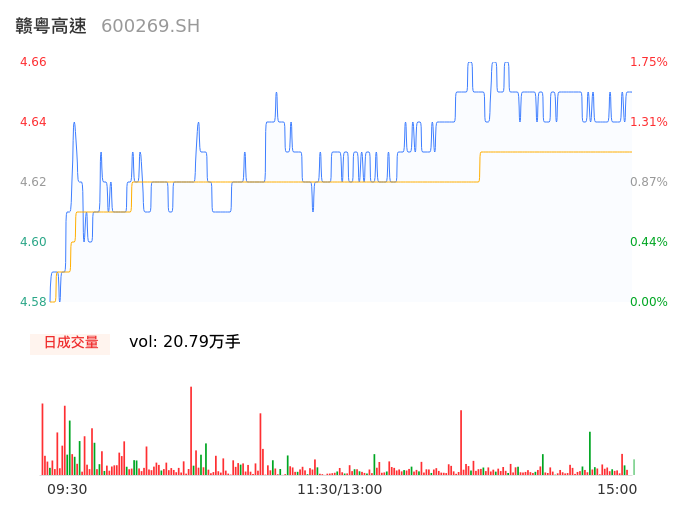 04月30日,赣粤高速收报4.64,股价涨幅1.31%,成交金额9622.35万元,换手率0.89%。