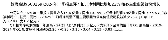 值得注意的是:2024年04月华创证券的吴一凡/吴晨玥/黄文鹤/梁婉怡分析师,首次发布关于赣粤高速的研究报告,标题为:赣粤高速(600269)2024年一季报点评:扣非净利同比增加22% 核心主业业绩较快增长。