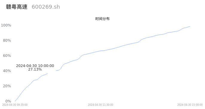 600269赣粤高速2024年04月30日成交20.79万手,成交金额9622.35万元,相较昨日缩量9.67万手,换手率0.89%,成交清淡。