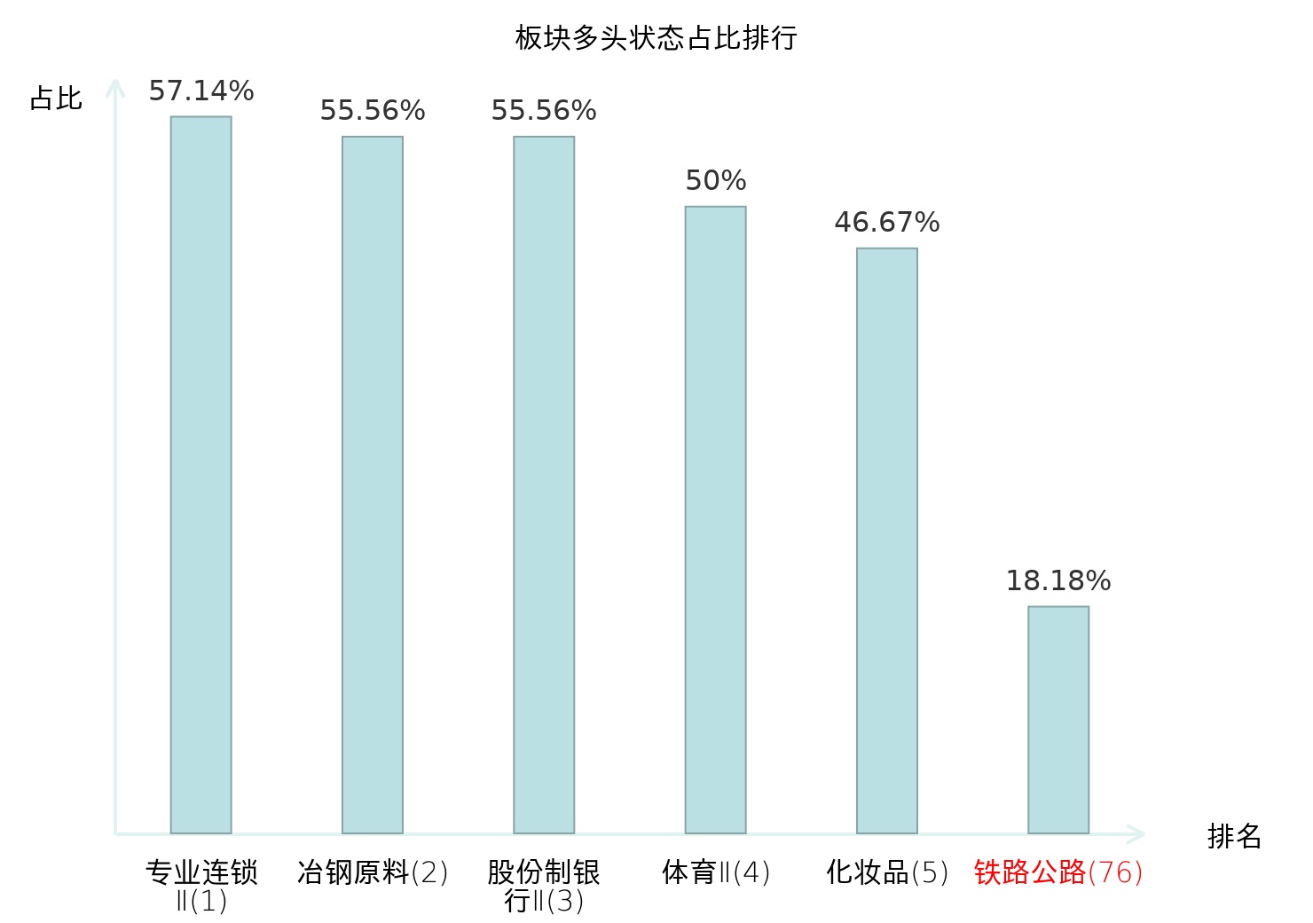 全市场所有行业板块中主力多头状态占比排名中,专业连锁Ⅱ板块位居第一。乘用车板块名次提升最快,较昨日上升85位。