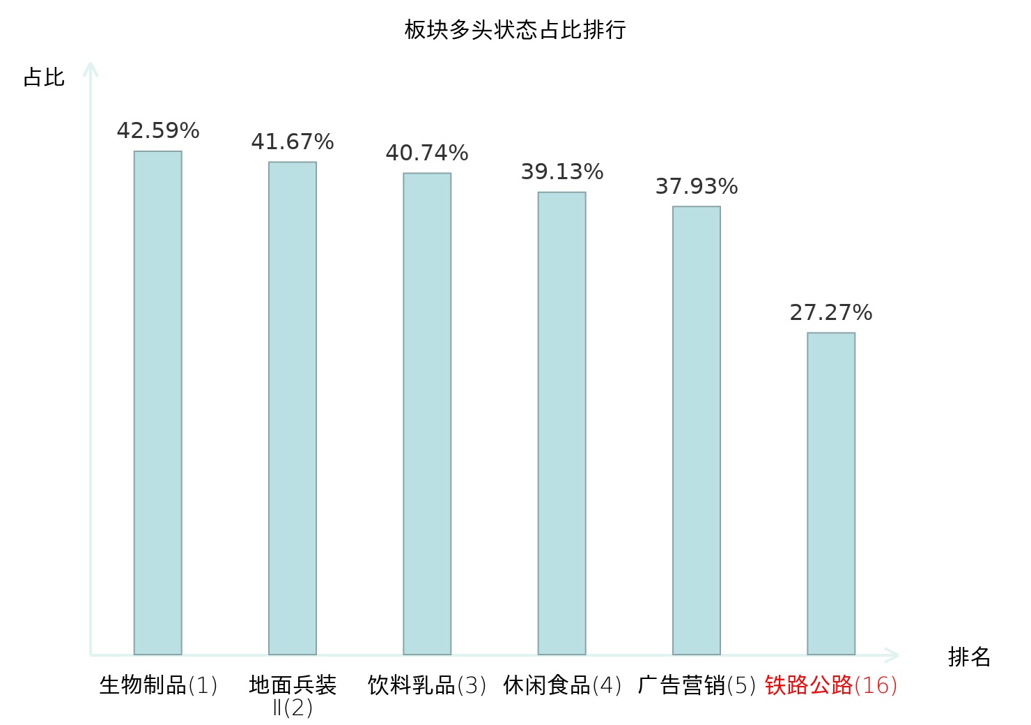 全市场所有行业板块中主力多头状态占比排名中,生物制品板块位居第一。黑色家电板块名次提升最快,较昨日上升65位。