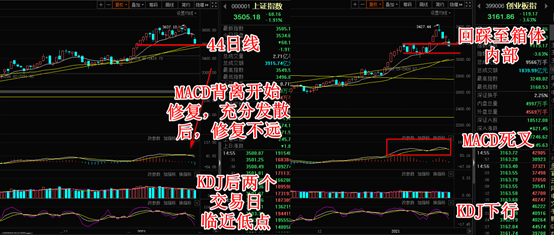 其次从技术面来看,创业板未能修复,回踩至年初的震荡蓄势箱体内,跌破12日线,MACD双顶死叉,KDJ下行,但短周期来看,已经在超卖,明早惯性下跌后,修复的概率居多。对比来看上证的形态更为清晰,MACD持续发散,明天惯性低开后,MACD充分发散,背离开始化解,KDJ临近低位,修复不远,也正好回踩44日线,3500蓄势为主。