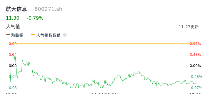 11月27日,航天信息收报11.30,股价涨幅-0.79%,成交金额1.41亿元,换手率0.67%。
