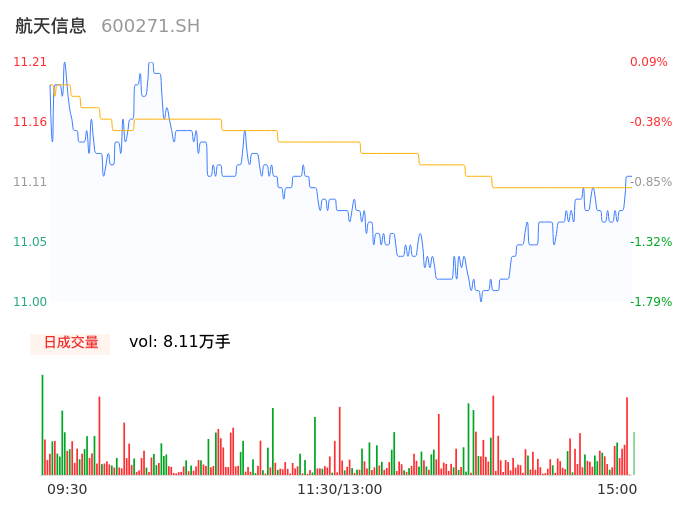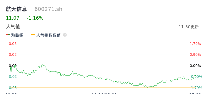 11月30日,航天信息收报11.07,股价涨幅-1.16%,成交金额8993.55万元,换手率0.44%。