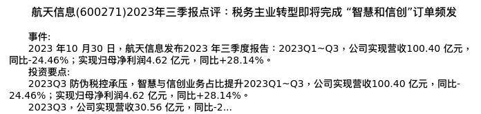 值得注意的是:2023年11月国海证券的刘熹分析师,首次发布关于航天信息的研究报告,标题为:航天信息(600271)2023年三季报点评:税务主业转型即将完成 “智慧和信创”订单频发。