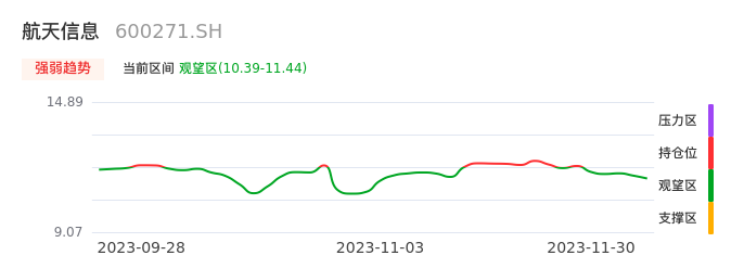 我们来看一下该股的九方特色指标强弱趋势的情况:航天信息自11月24日从持仓区下穿到观望区,股价近期持续走弱。短期已经进入空头行情,且下跌动能仍未衰竭。建议继续谨慎观望。