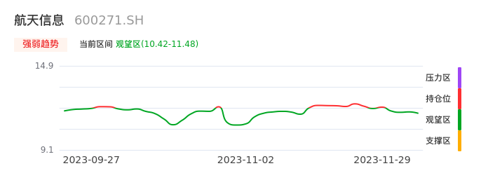 我们来看一下该股的九方特色指标强弱趋势的情况:航天信息自11月24日从持仓区下穿到观望区,股价近期持续走弱。短期已经进入空头行情,且下跌动能仍未衰竭。建议继续谨慎观望。