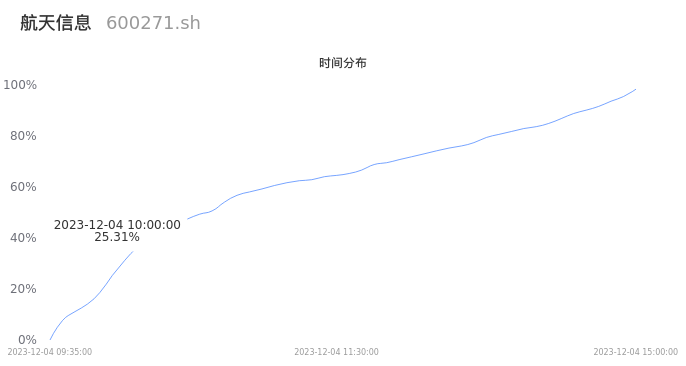 首先我们来看当日成交的时间分布。将今日交易时间按照5分钟的时间间隔进行切片,并绘制分布直方图进行观察。可以发现,10点之前的成交量占全天成交量的25.31%,这说明,该股票活跃时段换手率一般,资金热度较一般。