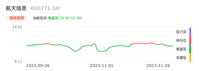 我们来看一下该股的九方特色指标强弱趋势的情况:航天信息自11月24日从持仓区下穿到观望区。股价近期持续下跌后,短期出现止跌迹象。后续重点关注能否再次站上多空分界点:11.50元。如未能有效突破则可能进入新一轮空头行情。