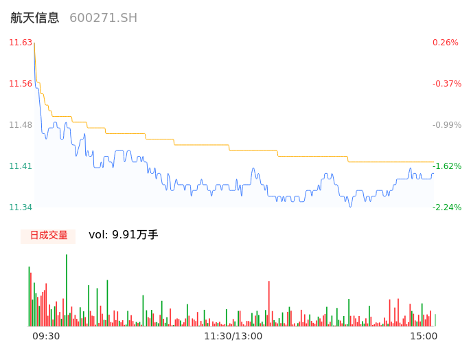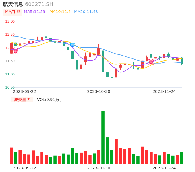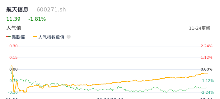 11月24日,航天信息收报11.39,股价涨幅-1.81%,成交金额1.13亿元,换手率0.53%。