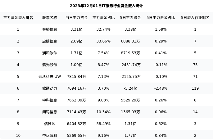 从主力资金流向来看,IT服务行业今日主力资金流入120.32亿元,在所有申万二级行业中排名:64/131。