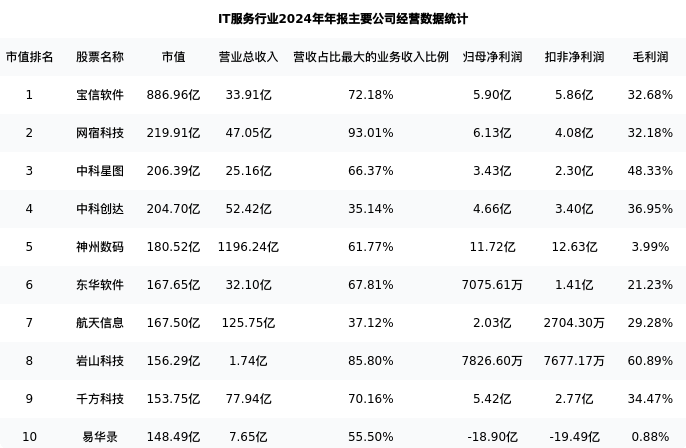 航天信息最新报告期数据为年报,下表汇总了IT服务行业内市值靠前的公司年报主要经营数据