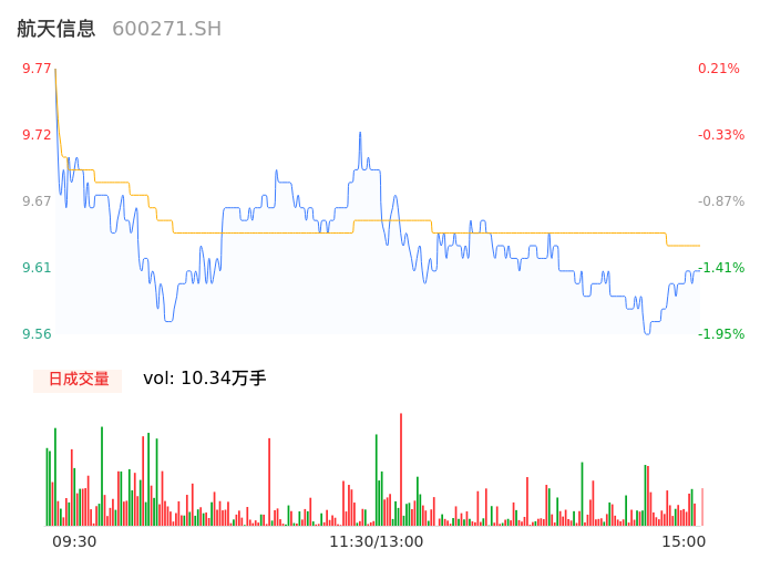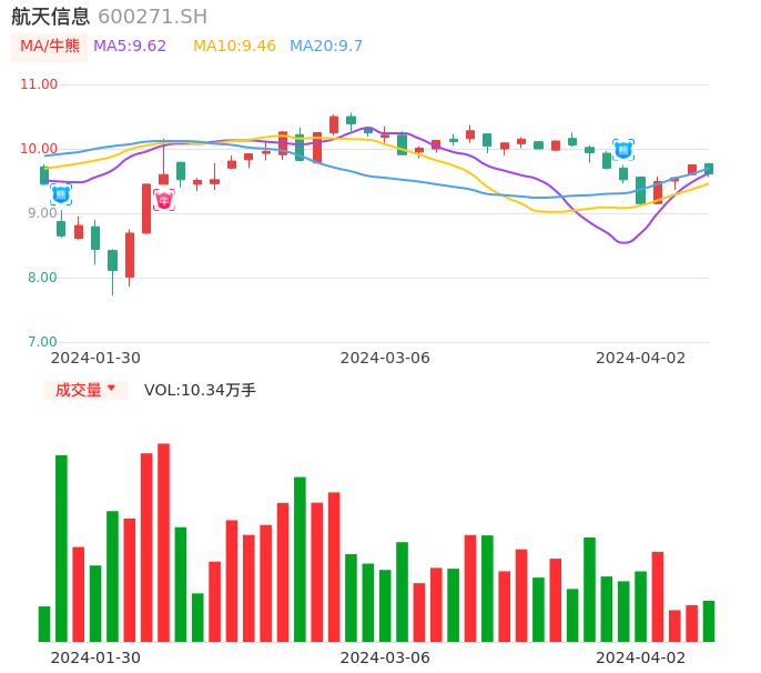 04月02日,航天信息收报9.61,股价涨幅-1.44%,成交金额9959.91万元,换手率0.56%。