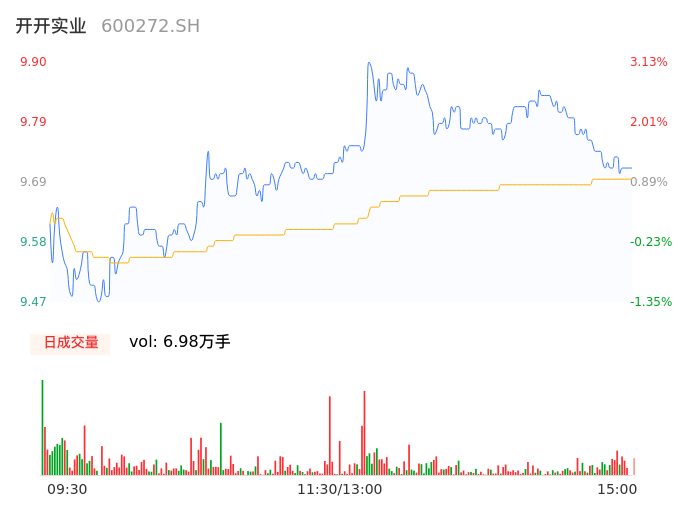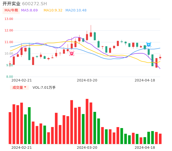 04月18日,开开实业收报9.71,股价涨幅1.15%,成交金额6791.70万元,换手率4.38%。