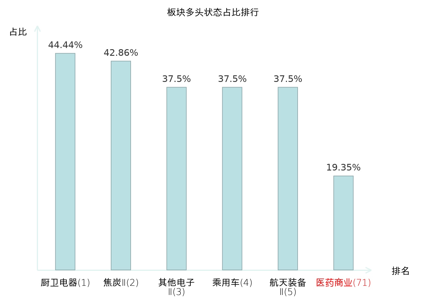 全市场所有行业板块中主力多头状态占比排名中,厨卫电器板块位居第一。元件板块名次提升最快,较昨日上升69位。