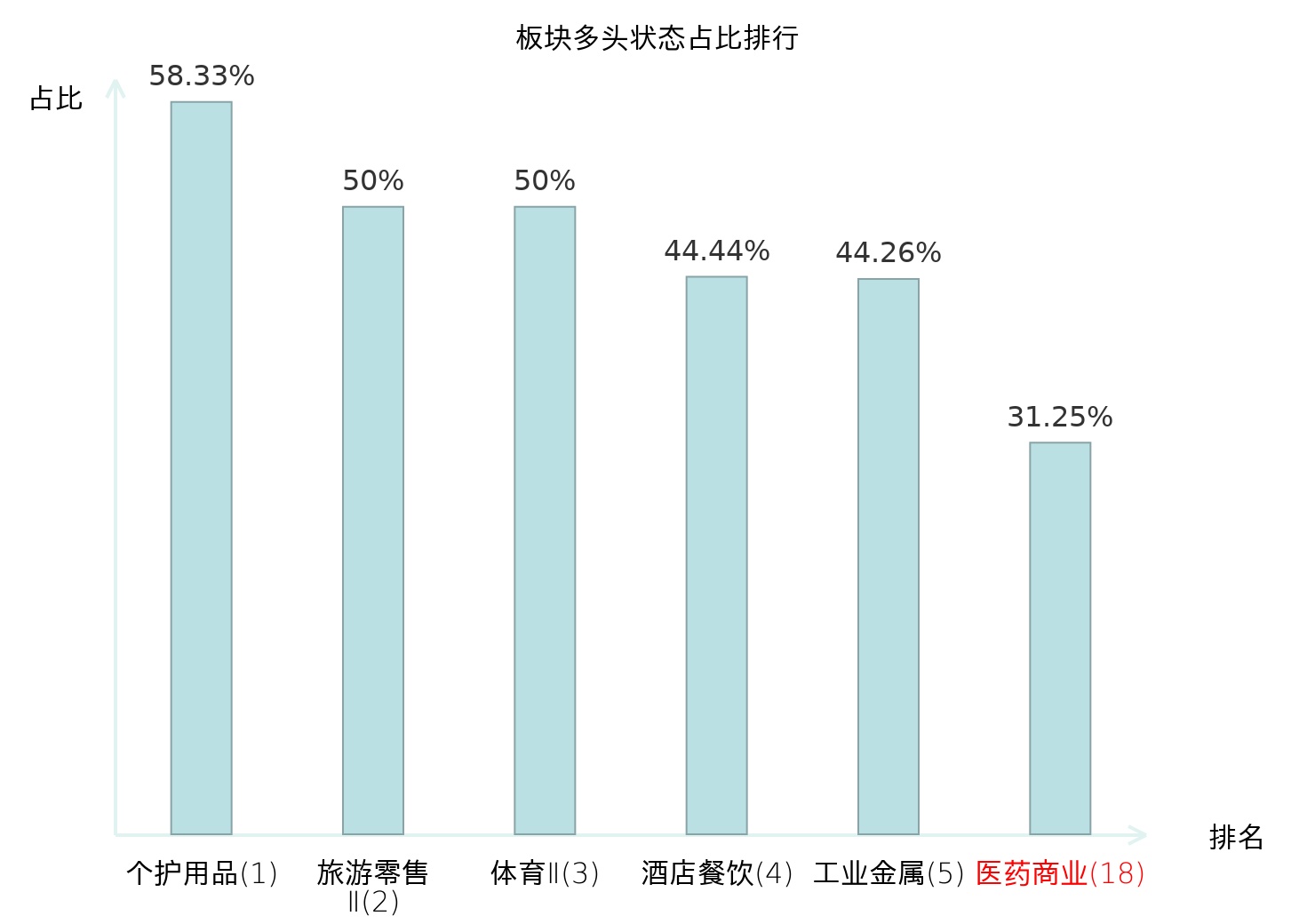 全市场所有行业板块中主力多头状态占比排名中,个护用品板块位居第一。非白酒板块名次提升最快,较昨日上升65位。