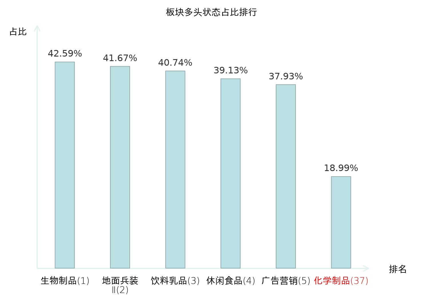 全市场所有行业板块中主力多头状态占比排名中,生物制品板块位居第一。黑色家电板块名次提升最快,较昨日上升65位。