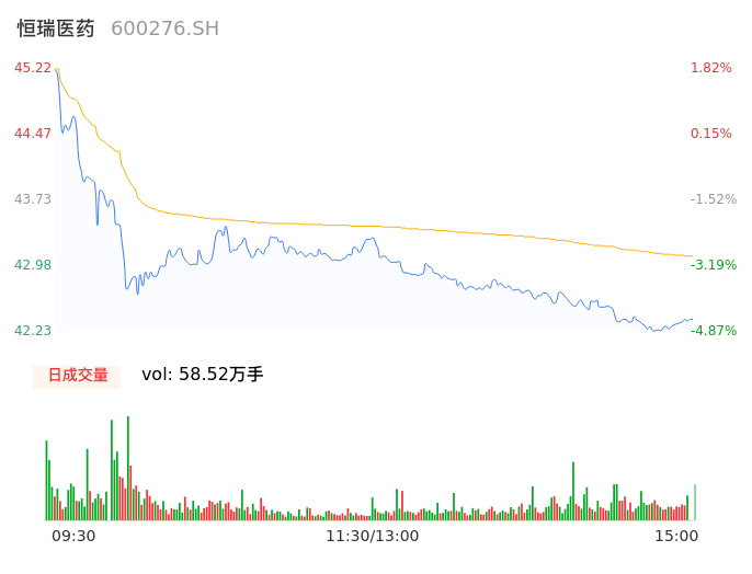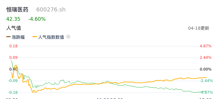04月18日,恒瑞医药收报42.35,股价涨幅-4.60%,成交金额25.42亿元,换手率0.93%。