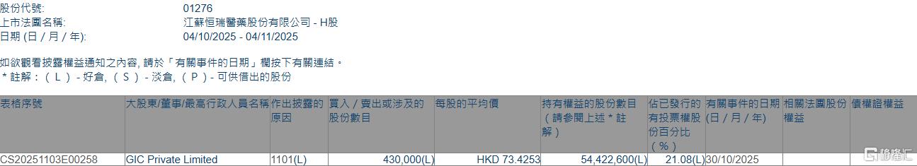 格隆汇11月4日丨根据联交所最新权益披露资料显示,2025年10月30日,恒瑞医药(01276.HK)获GIC Private Limited在场内以每股均价73.4253港元增持43万股,涉资约3157.29万港元。