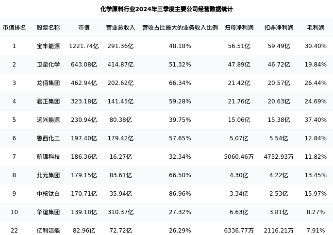 亿利洁能最新报告期数据为三季度,下表汇总了化学原料行业内市值靠前的公司三季度主要经营数据