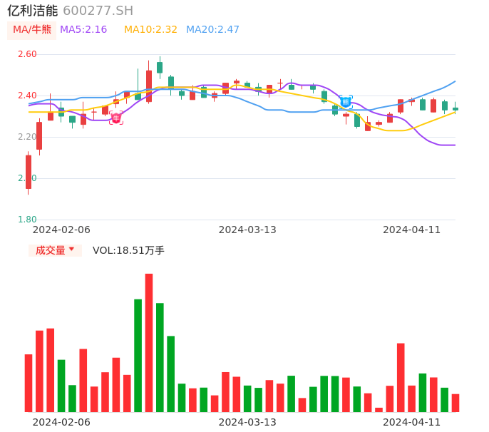 04月11日,亿利洁能收报2.33,股价涨幅0.00%,成交金额4334.24万元,换手率0.52%。
