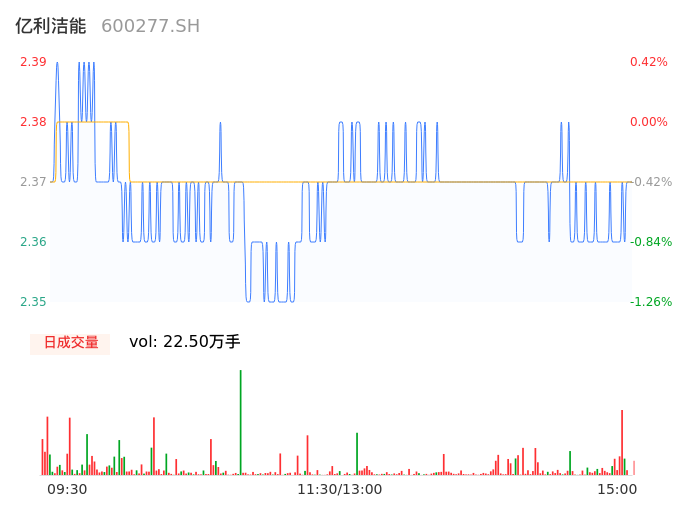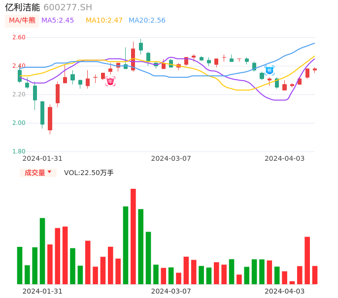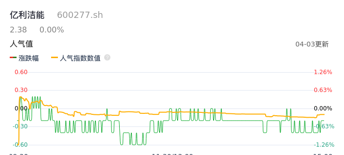 04月03日,亿利洁能收报2.38,股价涨幅0.00%,成交金额5330.23万元,换手率0.63%。