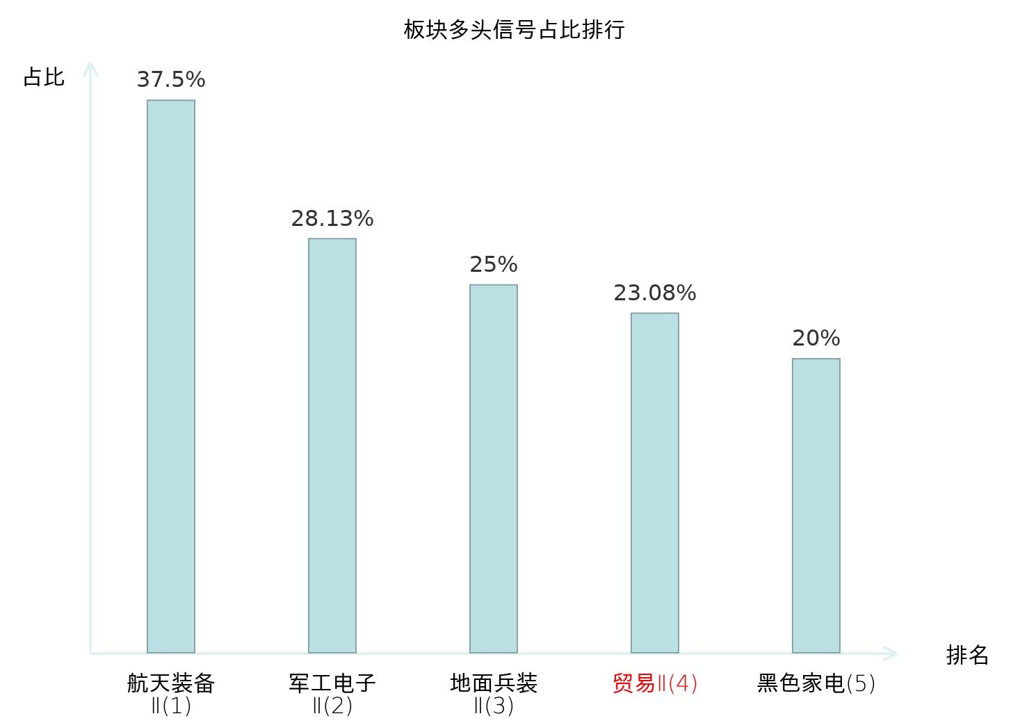 全市场所有行业板块中主力多头信号占比排名中,航天装备Ⅱ板块位居第一。航天装备Ⅱ板块名次提升最快,较昨日上升120位。