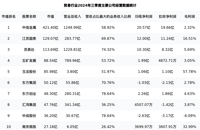 东方创业最新报告期数据为三季度,下表汇总了贸易行业内市值靠前的公司三季度主要经营数据