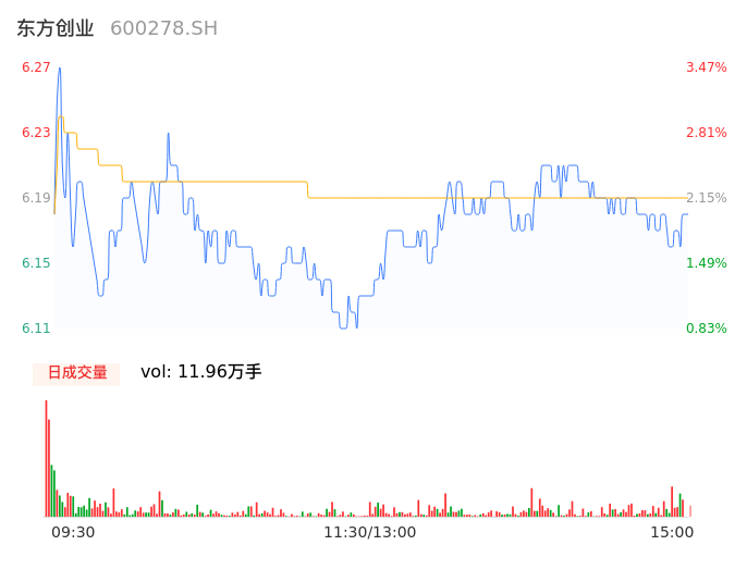 04月30日,东方创业收报6.18,股价涨幅1.98%,成交金额7394.60万元,换手率1.38%。