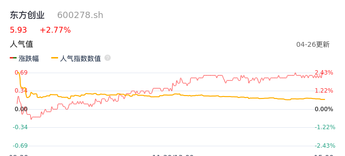 04月26日,东方创业收报5.93,股价涨幅2.77%,成交金额2959.68万元,换手率0.58%。