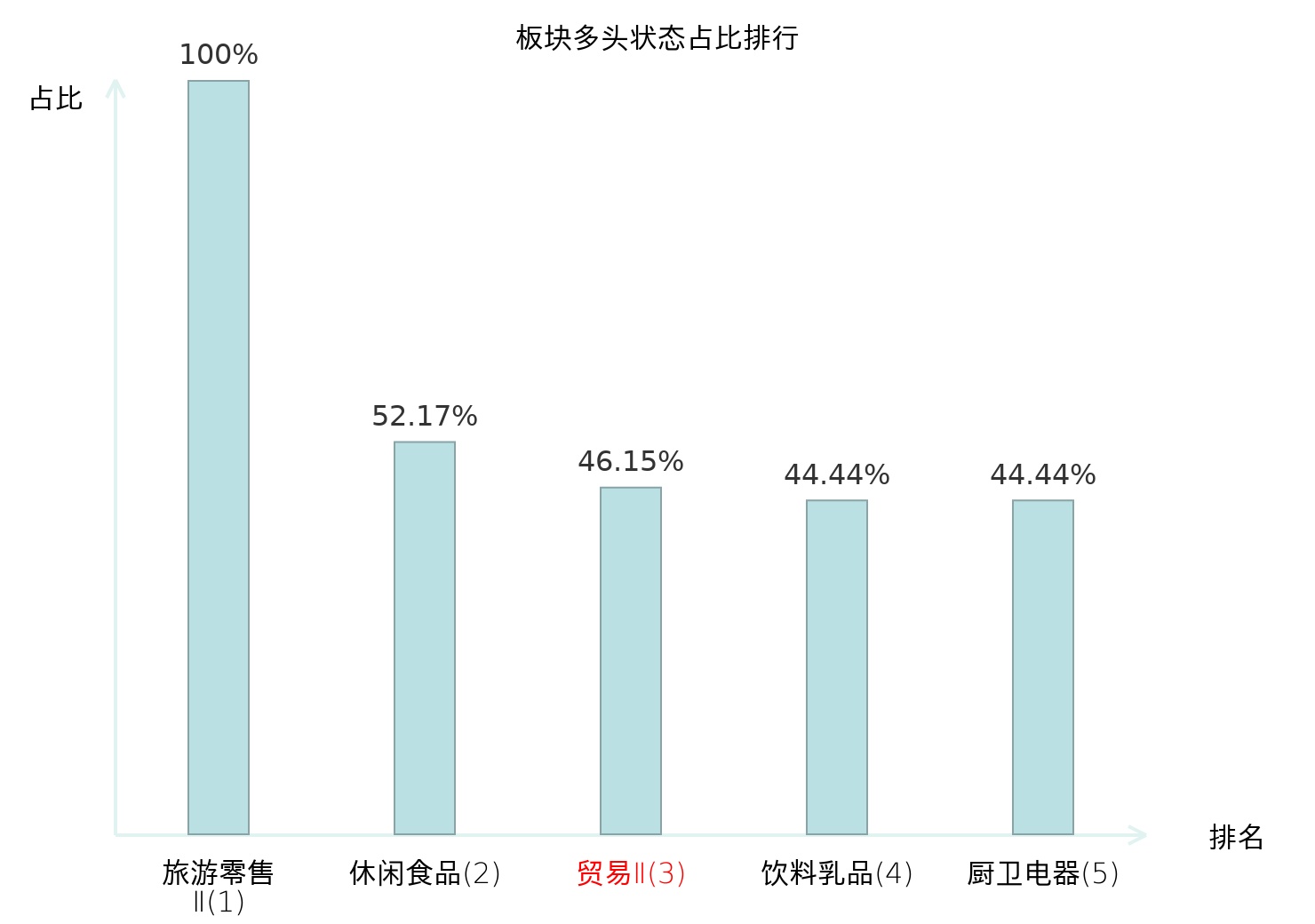 全市场所有行业板块中主力多头状态占比排名中,旅游零售Ⅱ板块位居第一。乘用车板块名次提升最快,较昨日上升91位。