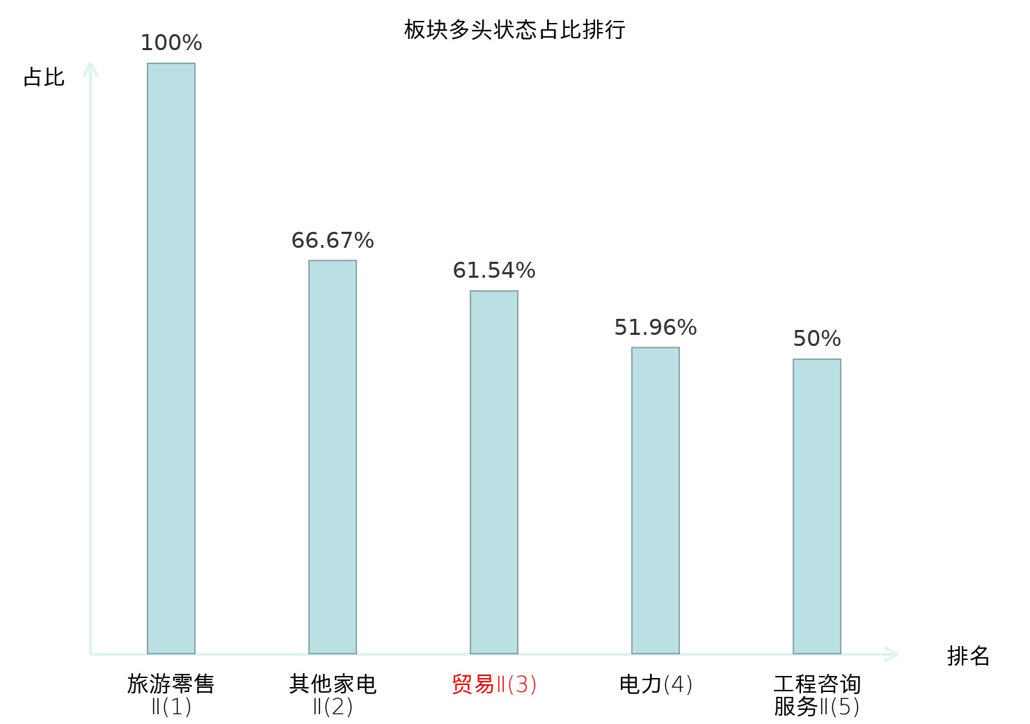 全市场所有行业板块中主力多头状态占比排名中,旅游零售Ⅱ板块位居第一。文娱用品板块名次提升最快,较昨日上升84位。