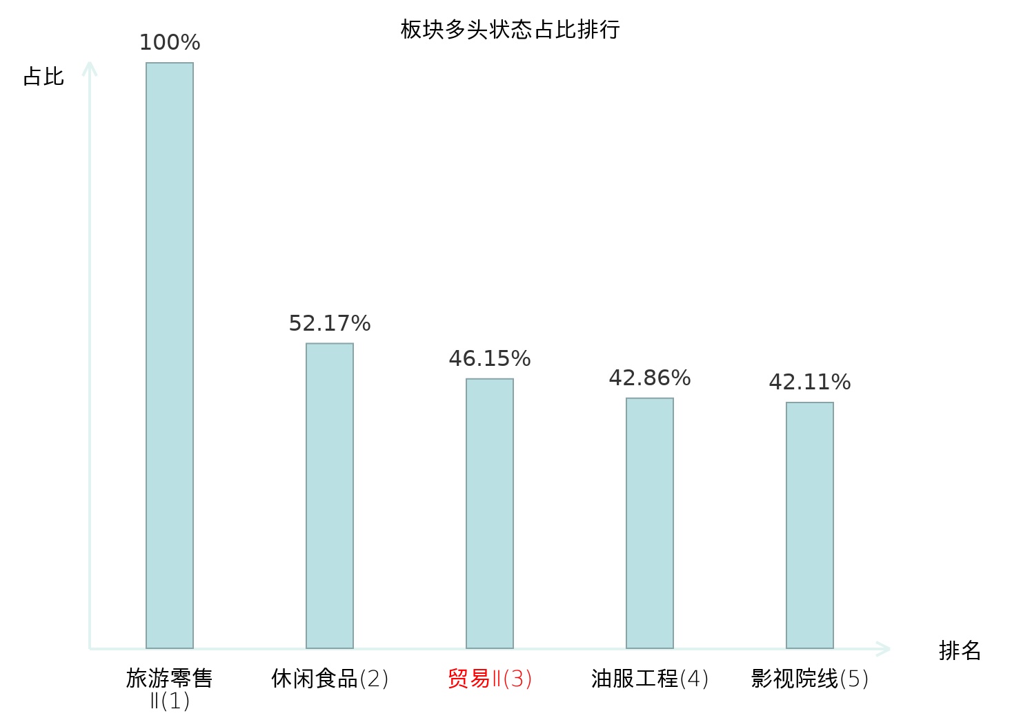 全市场所有行业板块中主力多头状态占比排名中,旅游零售Ⅱ板块位居第一。体育Ⅱ板块名次提升最快,较昨日上升99位。