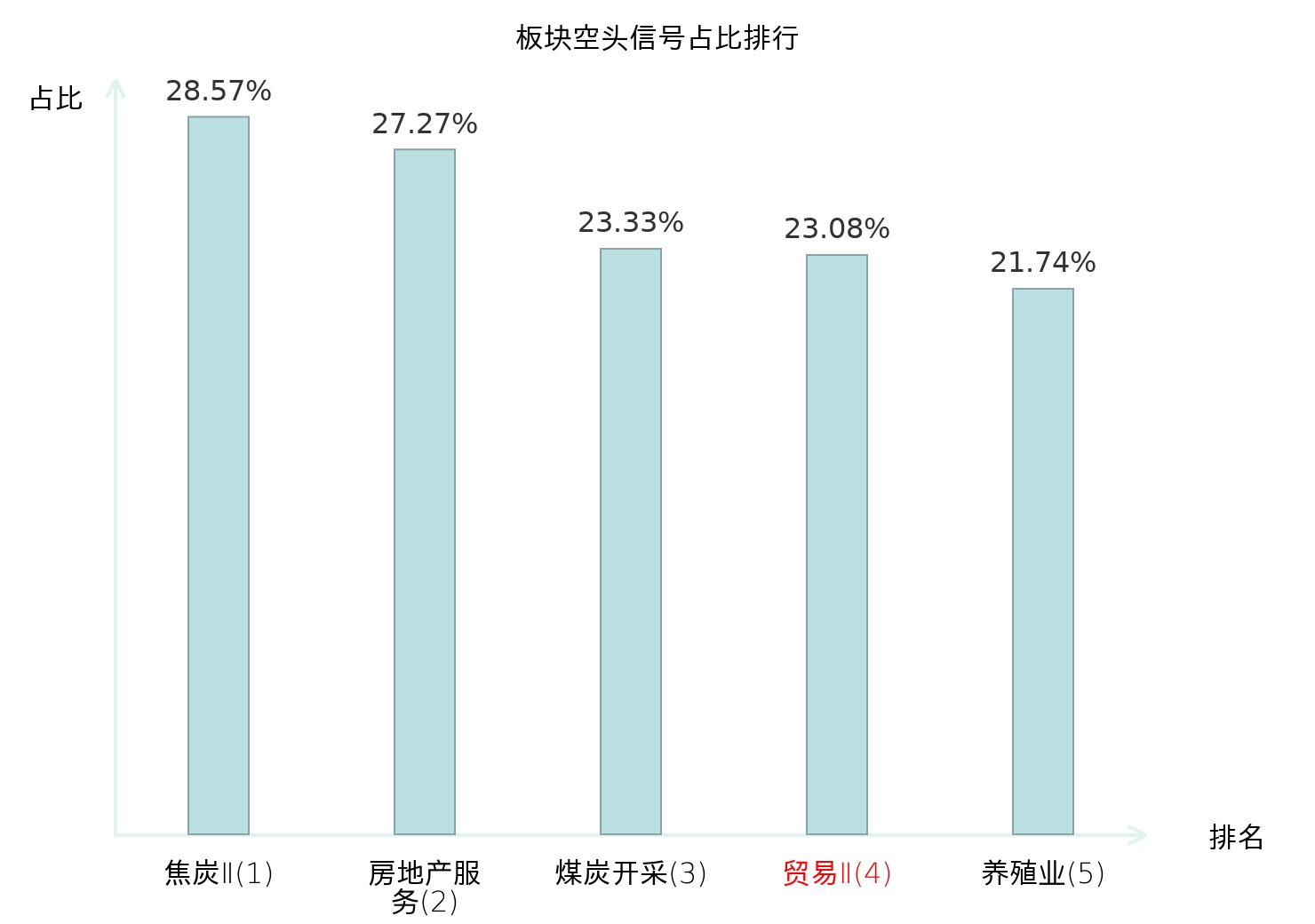 全市场所有行业板块中主力空头信号占比排名中,焦炭Ⅱ板块位居第一。养殖业板块名次提升最快,较昨日上升107位。