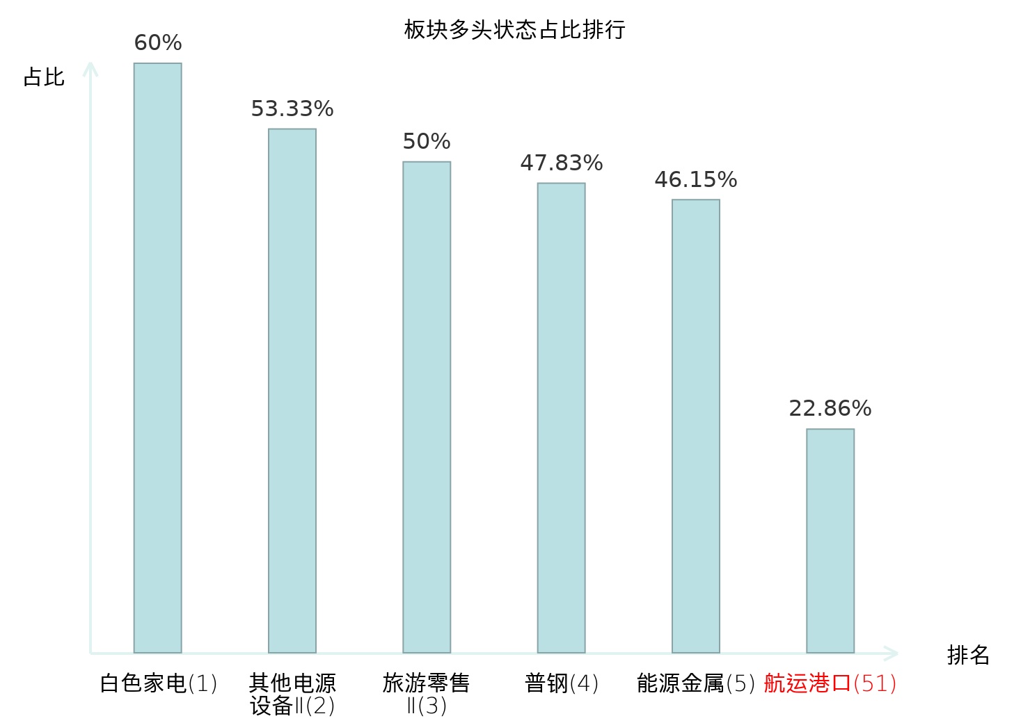 全市场所有行业板块中主力多头状态占比排名中,白色家电板块位居第一。照明设备Ⅱ板块名次提升最快,较昨日上升55位。